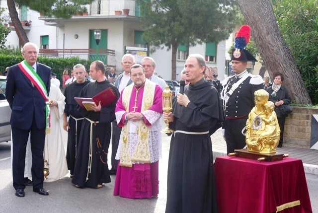 Erano le 17.30 quando, puntualmente, il mezzo busto contenente i sacri resti del santo, una costola e parte dell’apparato vocale, è stato scortato in auto fino in piazza San Francesco dove ad attenderlo c’erano le autorità civili e militari e, intorno alla piazza, una folla composta di fedeli in silenziosa preghiera: «Noi frati di Padova – ha esordito Padre Luciano Marini, responsabile del pellegrinaggio delle reliquie – siamo lieti davvero di portare in questa città le reliquie di Sant’Antonio. Questo non è solo un momento di devozione, ma è una missione antoniana: noi desidereremmo che Sant’Antonio potesse continuare la sua missione, quella di annunciare l’unica parola che salva: il Vangelo».
