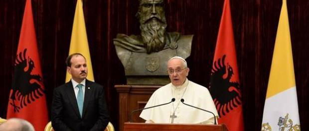 «Nessuno pensi di poter farsi scudo di Dio mentre progetta e compie atti di violenza e di sopraffazione». Lo ha affermato ieri Papa Francesco nell’incontro con le autorità civili, il Corpo diplomatico e alcuni capi religiosi nel Palazzo Presidenziale di Tirana, aprendo la sua visita pastorale in Albania, condannando gli estremisti che travisano il senso religioso, in primis i componenti dell’Isis, approfondendo i temi forti dei diritti umani, della libertà religiosa e della convivenza tra religioni.
