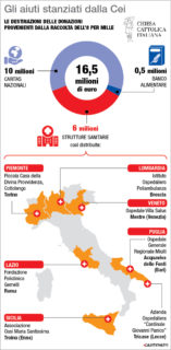 «In risposta ad alcune delle tante situazioni di necessità in sanità, la Conferenza episcopale italiana – raccogliendo il suggerimento della Commissione episcopale per la carità e la salute – ha stanziato finora 6 milioni di euro, in due tranche da 3 milioni, provenienti dall’otto per mille che i cittadini destinano alla Chiesa cattolica. Il primo contributo, del 24 marzo, raggiunge la Piccola Casa della Divina Provvidenza del Cottolengo di Torino, l’Azienda ospedaliera “Cardinale Giovanni Panico” di Tricase, l’Associazione Oasi Maria Santissima di Troina, nei pressi di Enna, e l’Istituto Ospedaliero Poliambulanza di Brescia. Il secondo, del 30 marzo, va a beneficio della Fondazione Policlinico Gemelli, dell’Ospedale Villa Salus di Mestre, dell’Ospedale Generale Regionale Miulli di Acquaviva delle Fonti in provincia di Bari. È stata inoltre aperta una raccolta fondi, che sarà puntualmente rendicontata e che potrà aiutare altre realtà».
