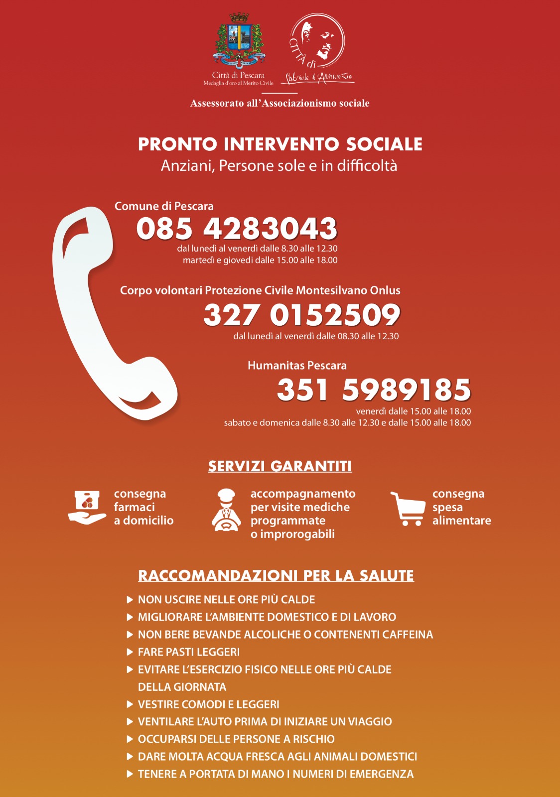 Per beneficiare del progetto “Emergenza Caldo – Pronto intervento sociale“, è possibile contattare il Comune (085 4283043 – dal lunedì al venerdì dalle ore 8.30 alle 12.30, martedì e giovedì anche dalle 15 alle 18), i volontari della Protezione civile di Montesilvano (327 0152509, dal lunedì al venerdì con orario 8.30-12.30) e il personale dell’Humanitas (351 5989185, il venerdì dalle 15 alle 18, sabato e domenica dalle 8.30 alle 12.30 e dalle 15 alle 18).