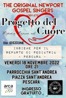 Come ogni anno, per la tredicesima edizione, si rinnova il Progetto del cuore dei The orginal Newport gospel singers: il noto coro gospel pescarese, diretto dalla maestra Mariagrazia Palusci, che venerdì 18 novembre 2022 alle ore 21 si esibirà nella parrocchia di Sant’Andrea Apostolo – in piazza Sant’Andrea a Pescara – devolvendo il ricavato delle offerte raccolta all’Unità operativa di Pediatria dell’ospedale civile di Pescara.