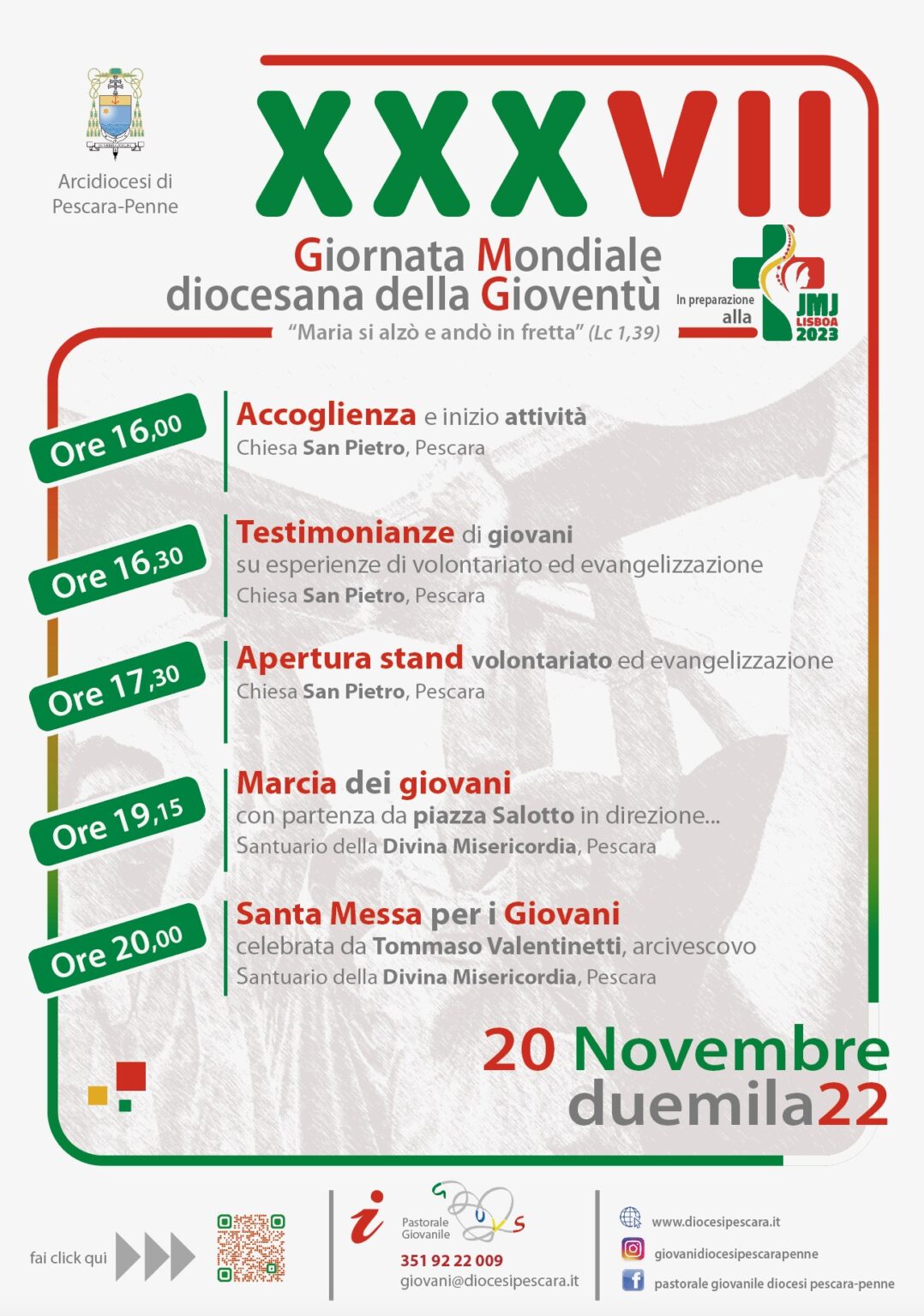 Anche nella Chiesa di Pescara-Penne, in particolare a Pescara, si svolgerà domani domenica 20 novembre 2022, nella solennità di Cristo re dell’universo, la 37ª Giornata mondiale della gioventù diocesana in preparazione alla 38ª Giornata mondiale della gioventù 2023 che si svolgerà a Lisbona, in Portogallo, dall’1 al 6 agosto prossimi.