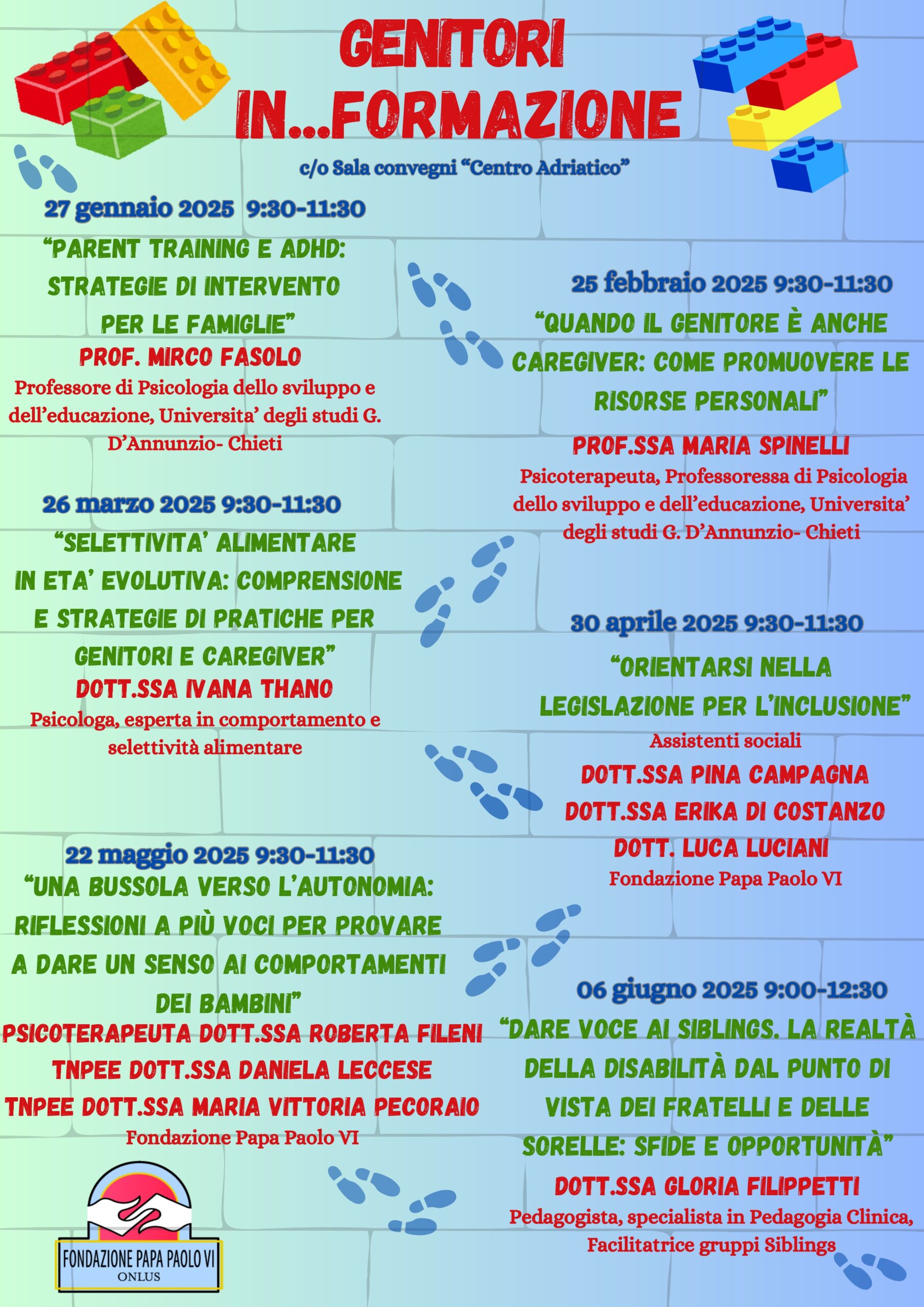 Si tratta di sei appuntamenti che avranno luogo una volta al mese, dalle 9:30 alle 12:30, presso la sala convegni del Centro Adriatico sul Lungomare Papa Giovanni XXIII 55 a Pescara: «Già da qualche anno – spiega la dottoressa Elisa Di Tillio, direttrice generale della Fondazione Paolo VI – la Fondazione mette a disposizione un calendario di appuntamenti nel quale si affrontano tematiche legate allo sviluppo dei bambini, alla gestione dei comportamenti e alle sfide