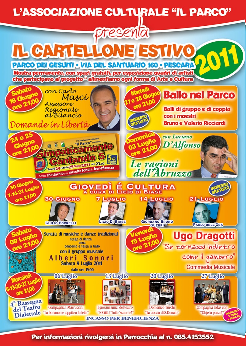 Ma questo è solo l’inizio, perché il programma prevede tutta una serie di serate con ospiti d’eccezione, letteratura, teatro dialettale, musica classica e satira:«Con questa iniziativa – ha spiegato Padre Pino Piva, parroco del Cristo Re – vogliamo tentare di spostare la cultura dal centro alla periferia, in modo che non resti chiusa nelle nicchie». In particolare, venerdì 24 e sabato 25 Giugno alle ore 21, i politici abruzzesi diverranno cantanti per due notti, esibendosi sul palco di “Simpaticamente cantando”: la kermesse di beneficenza giunta alla sua quinta edizione.