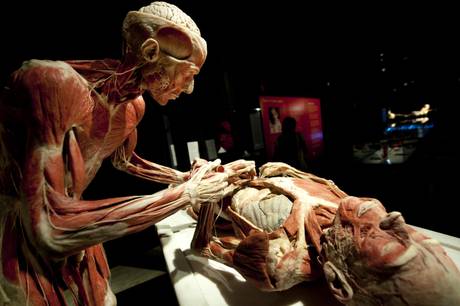 Il problema è che “Ma come fa?” è quasi l’unica domanda che i passanti si fanno davanti ai manifesti pubblicitarî della mostra, allestita dalla metà di settembre (a chi conosce il calendario liturgico il 14 sembrerà un presagio) nelle Officine Farneto. La risposta è piuttosto semplice, specie per i non addetti ai lavori, i quali devono necessariamente accontentarsi di non scendere in tecnicismi: mediante un processo chiamato “plastinazione”, tutti i tessuti di un corpo animale possono essere resi asciutti e inodori, rigidi ma non immobili. Si tratta in sostanza della sostituzione di polimeri di silicone a tutti i liquidi corporei (il peso finale del corpo è infatti grossomodo identico a quello iniziale): il corpo viene spogliato della naturale guaina cutanea e i tessuti sottostanti (muscoli, nervi, ossa, organi) vengono lasciati in vista. Nell’allestimento della mostra sono compresi i corpi integrali, i corpi semismembrati, i singoli organi, perlopiù seguendo un’idea direttrice – nel caso dell’allestimento romano quest’idea è il cuore. Sono visibili cuori di diverse età e di diverse condizioni di salute, anche muniti di peacemaker o valvole artificiali, e questo dato avrà il suo peso in un argomento che riprenderemo tra poco, dopo aver esposto la seconda delle (pochissime) domande che i passanti si fanno davanti al manifesto.