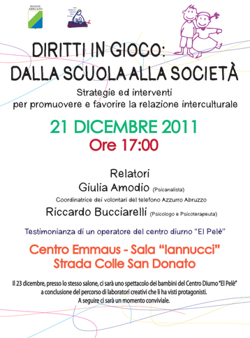 “Diritti in gioco: dalla scuola alla società”. Sarà questo il tema dell’incontro organizzato per mercoledì 21 dicembre dalla Caritas Diocesana di Pescara-Penne in collaborazione con la Regione Abruzzo.