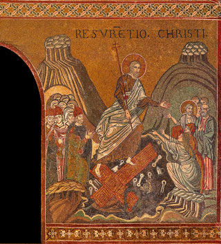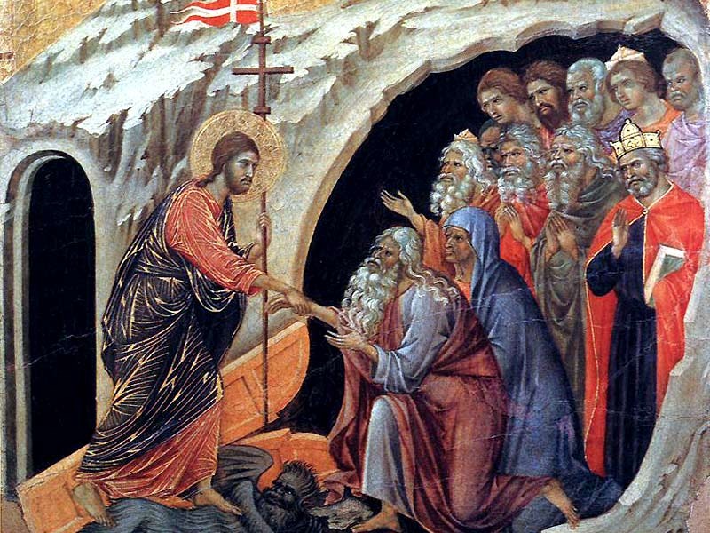 La risposta è abbastanza semplice: l’inno Sfolgora il sole di Pasqua non è ciò che tecnicamente possiamo definire in termini moderni una traduzione, ma piuttosto un riadattamento. I due testi presentano due impostazioni diverse e sviluppano due immagini differenti, anche se egualmente valide, della risurrezione. Nell’Aurora lucis rutilat Cristo assume i tratti di un rex fortissimus, sovrano e condottiero valoroso e potente, che spezza le catene della morte, schiaccia sotto il suo piede il regno degli inferi e rende la libertà alle anime prigioniere. Tutta la seconda strofa è infatti una rappresentazione vivida e visibile della discesa di Cristo agli inferi. Secondo la Scrittura, dopo la morte Cristo discese agli inferi, portò la lieta novella alle anime prigioniere (cf. 1Pt 3,19; 4,6), liberò i giusti che lo avevano preceduto e risalì risorgendo dai morti (cf. 1Cor 15,20; Ef 4,10). Questo articolo di fede è stato tradotto in arte figurativa da molti artisti, che hanno rappresentato proprio la scena in cui Cristo abbatte le porte degli inferi, strappa con forza le anime dei giusti dalla loro prigionia e schiaccia il demonio sotto i suoi piedi (vd. per es. l’icona del Duomo di Monreale o il dipinto di Duccio di Buoninsegna). Questa immagine (che ha la sua matrice in Gn 3,15: «essa ti schiaccerà il capo») è stata applicata a santi e martiri che con la propria testimonianza hanno vinto il demonio (ricordiamo solo il più noto, san Michele). Di tutta la riflessione circa la discesa di Cristo agli inferi nella versione italiana resta solo una debole traccia («Dagli abissi della morte / Cristo ascende vittorioso / insieme agli antichi padri»).