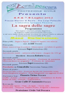 Ma a rendere speciale questa sagra è indubbiamente l’organizzazione, curata dai volontari della Protezione Civile “Valpescara”, come la sua finalità benefica: «Infatti – ha spiegato Antonio Romano, presidente dell’associazione – il ricavato della kermesse sarà devoluto per l’acquisto di un mezzo antincendio da impiegare nelle nostre attività estive di avvistamento e spegnimento degli incendi boschivi».