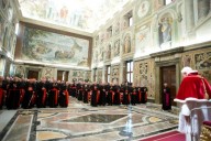 «Tra di voi, tra il Collegio cardinalizio, c’è anche il futuro Papa, al quale già oggi prometto la mia incondizionata reverenza ed obbedienza». Con queste parole umili, semplici e concrete, già proiettate verso un futuro della Chiesa senza di lui, ma al tempo stesso con lui nella preghiera, Benedetto XVI stamani ha salutato la Curia romana, ricevendola nella Sala Clementina del Palazzo Apostolico, nel suo ultimo giorno da Pontefice.
