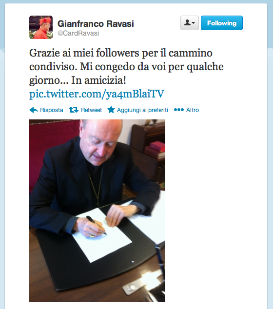 E intanto ieri anche il Card. Ravasi si è congedato dai suoi followers in vista del conclave e dell’extra omnes: «Grazie ai miei followers per il cammino condiviso. Mi congedo da voi per qualche giorno… In amicizia!». Chissà che non torni sul social con un altro profilo…