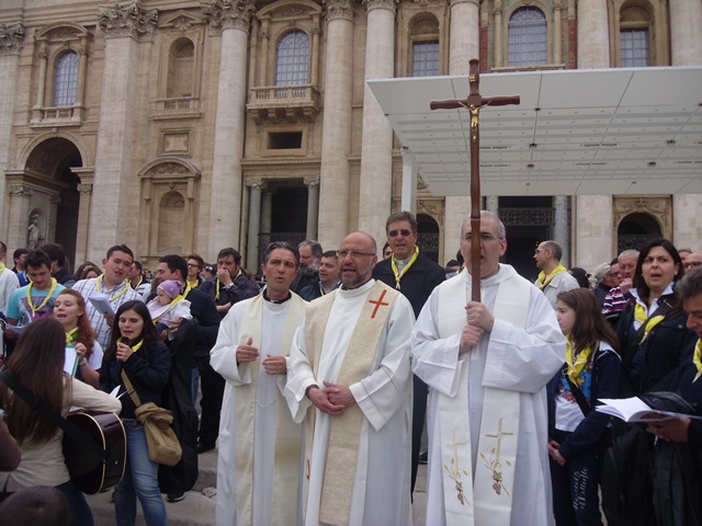 I giovani dando vita ad allegri e colorati cortei, avendo in dosso la bandana gialla ufficiale della giornata, sono giunti in piazza arrivando per singoli gruppi parrocchiali e mentre i primi aspettavano gli altri, l’emozione per l’esperienza e l’incontro che stava per attenderli aumentava di minuto in minuto: «Siamo veramente felici – ha commentato don Domenico Di Pietropaolo, direttore della Pastorale Giovanile diocesana – di vivere questo momento di unità nella fede della nostra diocesi, oltre che di svolta per i nostri giovani». Ma poi, alle ore 18, il momento è arrivato e il portone centrale della Basilica di San Pietro si è spalancato lasciando entrare i 700 giovani pescaresi attraverso un corteo solenne, aperto dalla croce portata dal vicario episcopale per la Pastorale don Giorgio Moriconi e seguito da Don Domenico Di Pietropaolo e don Andrea Di Michele, sulle note dei canti eseguiti dai giovani stessi.