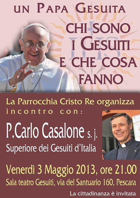 Si intitola “Un Papa gesuita: chi sono i gesuiti e cosa fanno” il convegno che questa sera, alle ore 21, verrà ospitato presso il teatro della parrocchia di Cristo Re a Pescara Colli, alla presenza di Padre Carlo Casalone, Superiore dei Gesuiti d’Italia. L’incontro sarà utile per far conoscere e approfondire meglio la presenza della comunità gesuita a Pescara che, da 83 anni, si è sempre distinta nell’ideazione e conduzione di percorsi formativi giovanili che hanno contribuito alla crescita di intere generazioni di pescaresi, formando l’attuale classe dirigente cittadina.