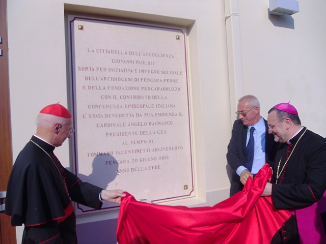 Sette anni di sacrifici economici, auspici, speranze, richieste e porte, tante porte, alcune aperte ed altre trovate chiuse, ma alla fine, da ieri, la Cittadella dell’accoglienza “Giovanni Paolo II”, in via Alento a Pescara, è realtà e a testimoniarlo c’era l’autorevole e prestigiosa presenza del cardinale Angelo Bagnasco, presidente della Conferenza episcopale italiana.