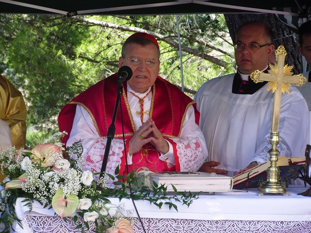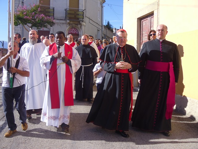 L’alto prelato, fin dal primo mattino, ha presenziato alle celebrazioni liturgiche avviatesi con la processione della statua mariana la quale, partita dalla chiesa parrocchiale di Pietranico con al seguito centinaia di fedeli molti dei quali emigrati all’estero e rientrati da Canada e Stati Uniti, ha attraversato le principali vie cittadine fino a raggiungere, dopo circa due ore di cammino, il piccolo oratorio che ha ospitato la Santa Messa, in esterno, presieduta dal cardinale Burke e concelebrata dal parroco don Faustino Libakata con decine di sacerdoti provenienti dall’arcidiocesi di Pescara-Penne, guidati dal vicario generale don Vincenzo Amadio, e dalle altre diocesi abruzzesi: «In questi quattro secoli – ha riflettuto il porporato, pronunciando l’omelia – così come anticamente i fedeli affidavano alla Madonna le proprie sofferenze personali, magari legate all’occupazione spagnola o alle pestilenze, ritrovando la speranza, anche oggi venendo incontro alla Madonna della Croce portiamo a Cristo le nostre sofferenze personali e le sofferenze del mondo, specialmente quelle vissute dal popolo siriano».