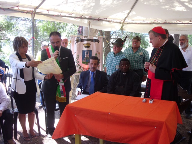 Successivamente, al termine della celebrazione eucaristica, al cardinale Burke è stata conferita la cittadinanza onoraria del Comune di Pietranico grazie ad una seduta straordinaria del Consiglio Comunale, svoltasi sul sagrato dell’oratorio, presieduto dal sindaco Francesco Del Biondo: «Nonostante i prestigiosi incarichi – ha annunciato il primo cittadino leggendo le motivazioni del gesto – ed impegni presi Sua Eminenza, il cardinale Raymond Leo Burke è venuto a pregare con la nostra gente contribuendo a diffondere la devozione mariana e dando lustro alla nostra comunità». Un’onorificenza, quest’ultima, che ha commosso il cardinale: «Sono molto grato all’onorevole sindaco – ha commentato il Prefetto del Supremo Tribunale della Segnatura apostolica vaticana – e a tutto il Consiglio comunale per questo grande onore che hanno voluto conferirmi, la cittadinanza onoraria di Pietranico, la quale sarà un gran ricordo di tutto il giorno in pellegrinaggio fino al Santuario, con la Santa Messa e l’invocazione dell’intercessione della Madonna della Santa Croce».