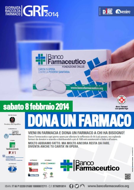 Si intitolerà “Dona un farmaco a chi ne ha bisogno” la quattordicesima Giornata di raccolta del farmaco che si svolgerà sabato 8 febbraio quando chiunque, recandosi nelle farmacie che aderiscono all’iniziativa, potrà acquistare e donare farmaci da automedicazione che verranno destinati alle persone in stato di povertà su tutto il territorio nazionale.