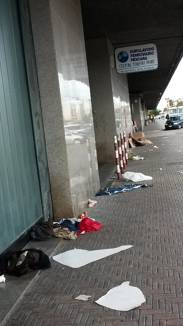 Sembrava essere la soluzione al problema del bivacco notturno dei senzatetto nei sottopassaggi ferroviari di Pescara centrale e invece il quotidiano intervento dell’amministrazione comunale, che ne assicura la pulizia e l’illuminazione, lo ha solo spostato di qualche decina di metri più in là: nel retro della stazione, sui marciapiedi di via Ferrari che di notte proliferano di cartoni rimasti ancora l’unico riparo per decine di clochard lasciati all’adiaccio dalla chiusura notturna dello scalo ferroviario.