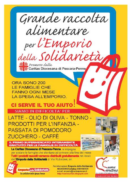 Quella di domani sarà la quarta edizione della Raccolta alimentare per l’Emporio della solidarietà, il supermarket pescarese aperto da quattro anni nella sede dell’ex Circoscrizione Portanuova in via Rubicone grazie all’impegno della Caritas diocesana, che aiuta dignitosamente centinaia di famiglie a fare la spesa quando, sempre più asfissiate dalla crisi e dalla disoccupazione, non riescono neanche più a permettersi l’acquisto di beni primari.