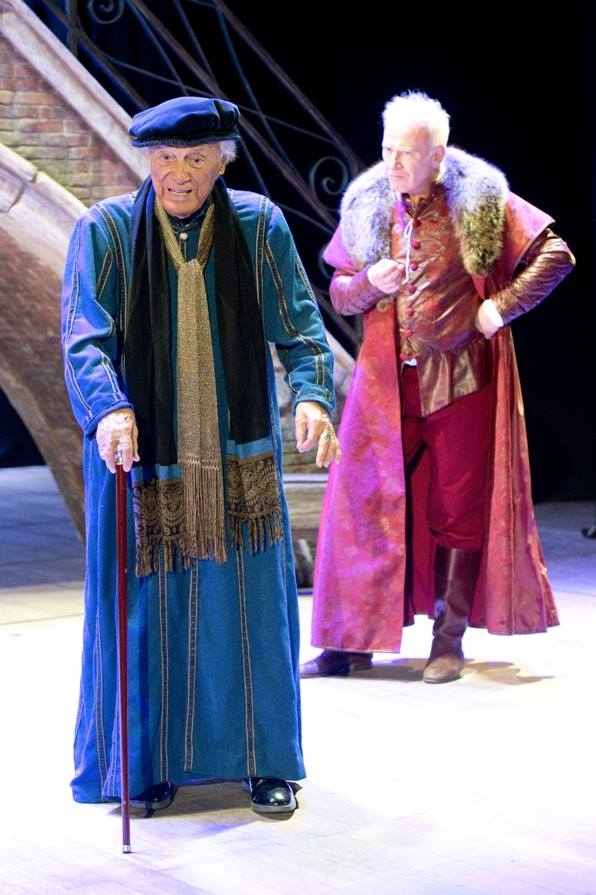 Giorgio Albertazzi (Shylock) e Franco Castellano (Antonio) in “Il Mercante di Venezia”, tuttora in scena al Teatro Quirino