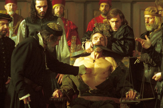 Fotogramma tratto da “The Merchant of Venice”, del 2004 (regia di Michael Radford) Al Pacino interpreta Shylock e Jeremy Irons Antonio. Dietro quest’ultimo, Joseph Fiennes nella parte di Bassanio