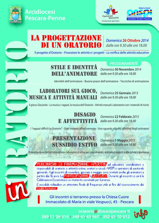 È giunto al suo secondo appuntamento Oratori 20.20: il nuovo corso formativo, ideato ed organizzato dalla Pastorale Giovanile dell’arcidiocesi di Pescara-Penne in collaborazione con l’Anspi (l’Associazione San Paolo Italia – Oratori e circoli), che attraverso cinque incontri mensili, ospitati dalle ore 9.30 alle ore 18 presso i locali parrocchiali del Cuore Immacolato di Maria in via Vespucci a Pescara, formerà gli educatori e gli animatori che, prossimamente, guideranno i nascenti oratori parrocchiali.