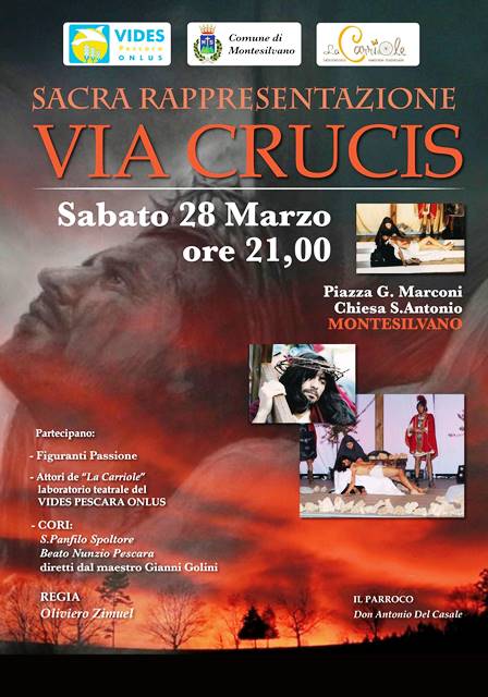 Sarà un ritorno indietro di 2 mila anni al momento della crocifissione di Cristo quello che accadrà a Montesilvano, sabato a partire dalle 21, grazie alla sacra rappresentazione della Via Crucis organizzata dall’associazione Vides Pescara Onlus, presieduta da Ivana Zuccarini, e dal laboratorio teatrale La Carriole, diretto dal regista Oliviero Zimuel. La rappresentazione, con il patrocinio del’amministrazione comunale, si terrà nel centro di Montesilvano.