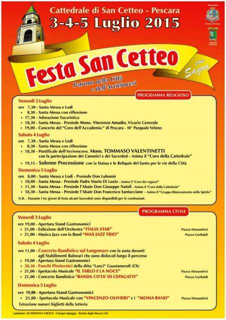 Un appuntamento, quest’ultimo, fortemente voluto dall’arcivescovo Valentinetti che ha deciso di raddoppiare la festività che, da calendario, si celebra il 10 ottobre: «Abbiamo voluto riportare la festa popolare in estate – spiega don Francesco Santuccione, abate della Cattedrale di San Cetteo -, proprio per consentire alla gente di ritrovarsi per celebrare San Cetteo, un uomo di pace che evangelizzò questa zone nel sesto secolo dopo Cristo e per questo subì il martirio venendo gettato nel fiume Pescara».