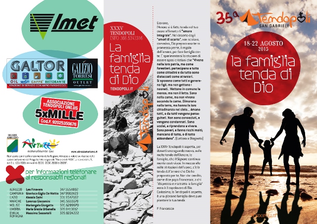 “La famiglia tenda di Dio”. Questo il titolo scelto per la trentacinquesima edizione della “Tendopoli” organizzata dai Padri Passionisti in programma dal 18 al 22 agosto a San Gabriele, in Abruzzo: «Ai piedi del Gran Gasso – si legge in una nota – giovani da tutta Italia per riflettere sulla bellezza e il valore della coppia e sui pericoli che la minacciano».