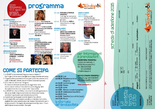 Venerdì 21 la relazione di Massimo Toschi e la Via Crucis serale sul piazzale del Santuario di San Gabriele. Sabato 22 la chiusura dell’evento con la “Festa dei giovani”, la marcia a piedi Isola-San Gabriele e la messa presieduta dal cardinale Edoardo Menichelli. Per ulteriori informazioni, è possibile visitare il sito web ufficiale della Tendopoli.