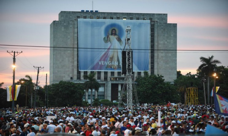 Una piazza che per l’occasione ha subito una metamorfosi, quella gremita da decine di migliaia di fedeli, perché oltre al ritratto murale del Che Guevara comparivano anche immagini di Gesù misericordioso, di Papa Francesco e di Madre Teresa di Calcutta: «Questo farci carico per amore – aggiunge il Pontefice, durante l’omelia – non punta verso un atteggiamento di servilismo, ma al contrario, pone al centro della questione il fratello: il servizio guarda sempre il volto del fratello, tocca la sua carne, sente la sua prossimità fino in alcuni casi a soffrirla e cerca la sua promozione. Per tale ragione il servizio non è mai ideologico, dal momento che non serve idee, ma persone».