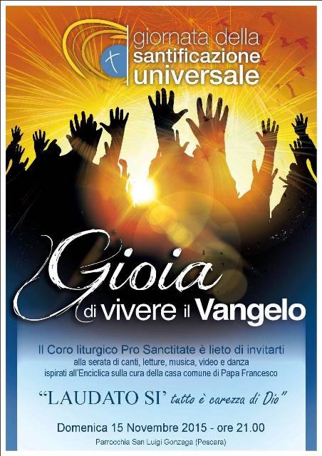 Sarà un modo innovativo per approfondire i contenuti e il messaggio dell’ultima enciclica di Papa Francesco “Laudato si” attraverso il canto e la musica l’Oratorio sacro dal titolo “Laudato si: tutto è carezza di Dio”, a cui il coro liturgico del Movimento Pro Sanctitate darà vita domenica sera, alle ore 21, nella parrocchia di San Luigi Gonzaga a Pescara.