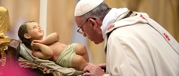 Papa Francesco si appresta a baciare l'effige di Gesù Bambino