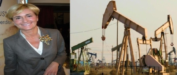 L'ex ministro dello Sviluppo economico Federica Guidi e, accanto, un pozzo per le estrazioni petrolifere