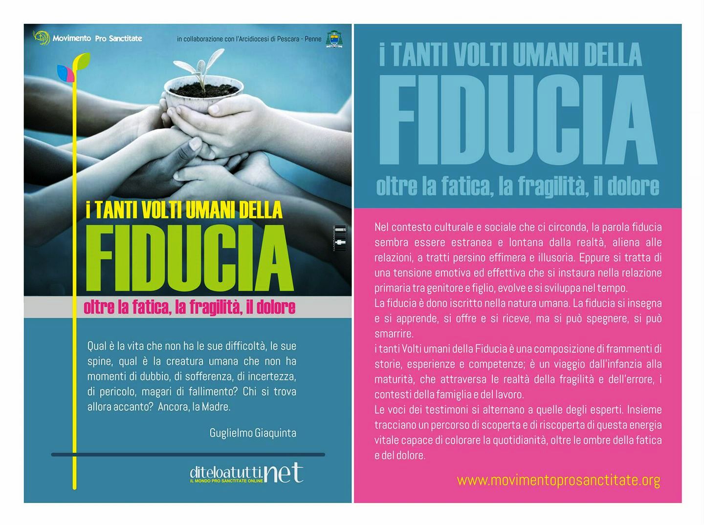 Sarà un’occasione per riscoprire la fiducia in tutti gli ambiti e le azioni compiute nel quotidiano l’incontro, organizzato dal Movimento Pro Sanctitate in collaborazione con l’arcidiocesi di Pescara-Penne, che si terrà domani alle ore 17 presso l’aula biblioteca dell’Ospedale Civile di Pescara sul tema “I tanti volti umani della fiducia” .