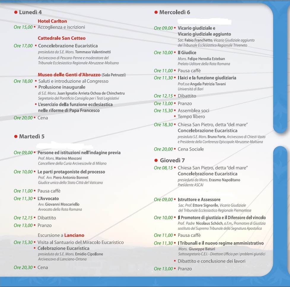 Ieri pomeriggio è stato l’arcivescovo di Pescara-Penne, nonché moderatore del Tribunale ecclesiastico abruzzese e molisano, monsignor Tommaso Valentinetti ad aprire i lavori del quarantanovesimo Congresso nazionale dell’Associazione canonistica italiana dal tema “I soggetti del nuovo processo matrimoniale canonico” – che si sta svolgendo presso l’Hotel Carlton di Pescara fino a giovedì – presiedendo la Santa messa nella Cattedrale di San Cetteo.