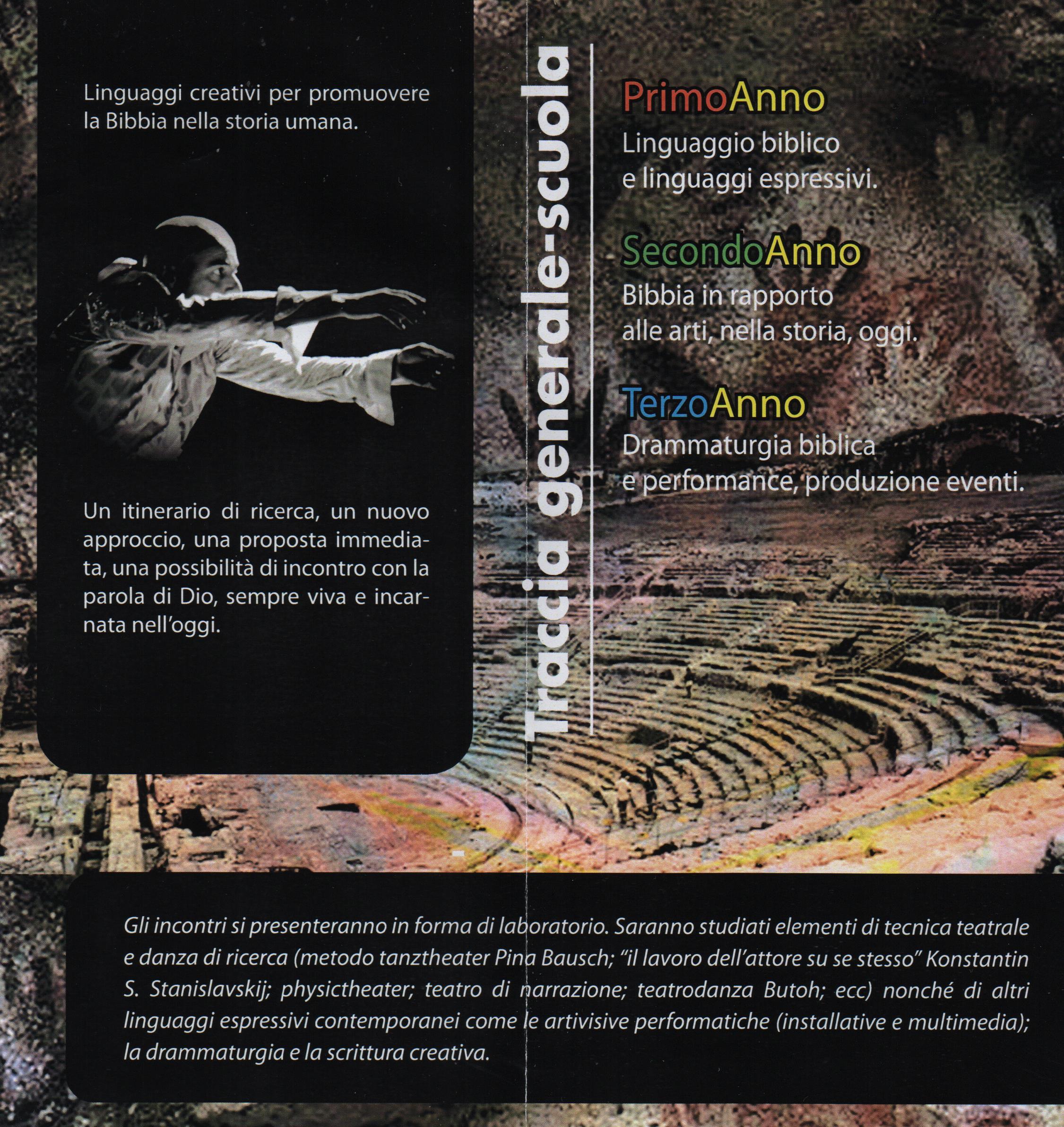 Il progetto è triennale: in particolare, sono aperte le iscrizioni al primo anno “Linguaggio biblico e linguaggi espressivi”: «Si tratta di aprire-aprirsi – spiega Beniamino Cardines, direttore artistico – a un’esplorazione, come ricerca originale che entri nella Bibbia e coinvolga attraverso la Bibbia verso la produzione di eventi contemporanei. Un laboratorio espressivo che diventa luogo di aggregazione, di condivisione, di progettazione e produzione di eventi culturali legati alle tematiche bibliche».