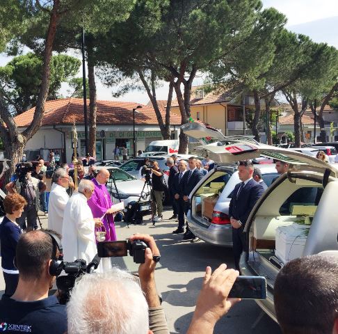 "Sono qui - afferma l'arcivescovo Valentinetti - per pregare con voi e con loro. Ma anche per un altro motivo, perché insieme a me voi abbiate il coraggio di puntare il dito contro il male, contro la morte. Solo se abbiamo questo coraggio saremo capaci di guardare al di là di queste bare, al di sopra di queste bare"