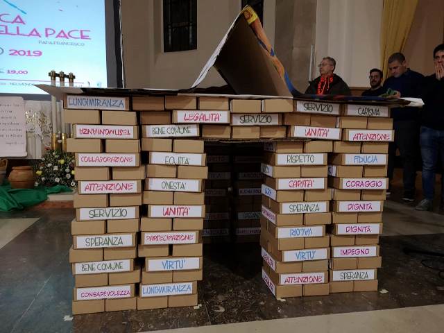 Da qui l’augurio finale: «Cari fratelli e cari amici, buon lavoro e buon impegno a tutti». Alla fine dell’evento ad ognuno è stato consegnato un mattone di cartone, ognuno dei quali riportava il nome di un valore necessario per realizzare una buona politica al servizio della pace. Così, mattone dopo mattone, è stata eretta una casa comune per ricordare e rilanciare l’impegno di tutti per realizzare una buona politica al servizio della pace. Una pace da costruire e per questo, ogni partecipante ha ricevuto come gadget un portachiavi con appeso un mattoncino.