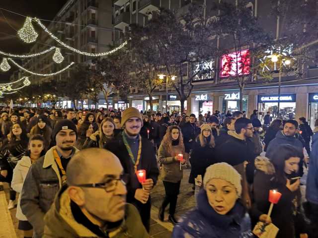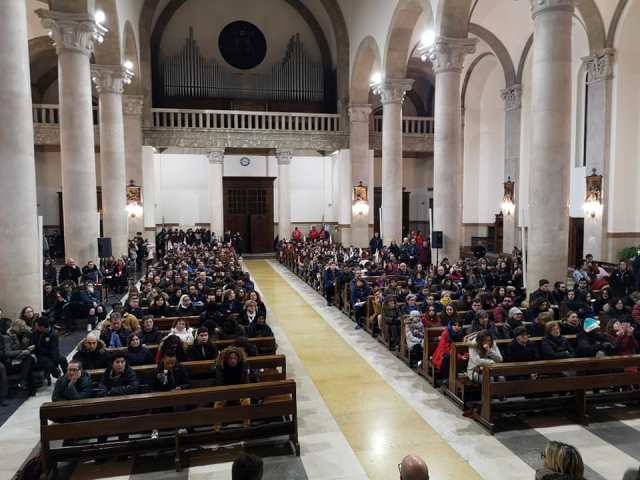 Successivamente c’è stata la partenza della Marcia per la pace vera e propria, con il tradizionale corteo guidato dal lungo striscione che ha dapprima attraversato Corso Umberto, per poi transitare attraverso Corso Vittorio Emanuele, piazza Duca d’Aosta, ponte Risorgimento, piazza Unione e via Conte di Ruvo per poi giungere all’interno della Cattedrale di San Cetteo dove la riflessione è proseguita, a cura delle associazioni e dei movimenti ecclesiali, con la lettura di passi del messaggio di Papa Francesco e di meditazioni, alternate a preghiere e testimonianze, come quella legata all’esperienza di cittadinanza attiva vissuta dall’Ufficio diocesano di Pastorale sociale e del lavoro: «Stiamo vivendo una bella esperienza di approfondimento dell’enciclica Laudato si’ – racconta il direttore don Antonio Del Casale – e dopo il convegno che abbiamo organizzato, con la presenza del sindaco di Assisi, abbiamo continuato a confrontarci su temi legati all’ambiente, concentrando la nostra attenzione sul Parco D’Avalos attraverso l’iniziativa “Più parco più vita”. Così abbiamo chiesto che all’interno del parco, non transitino più le automobili, riacquistando spazio verde. Il Comune di Pescara ha accolto questa nostra richiesta, inserendo nel piano di assetto il recupero dello spazio adesso occupato dalle strade che uniscono San Silvestro all’università. Quello spazio tornerà ad essere parco riacquistando la sua forma originale, mentre le strade passeranno sul limite esterno, che è davvero una garanzia di vita per tutti. Inoltre, stiamo focalizzando l’attenzione anche sul fiume Pescara dedicato al quale, tra maggio e giugno, dedicheremo un’iniziativa di sensibilizzazione alle tematiche legate al suo inquinamento, ma anche alla possibilità che possa essere davvero una fonte di vita e di gioia per tutti».