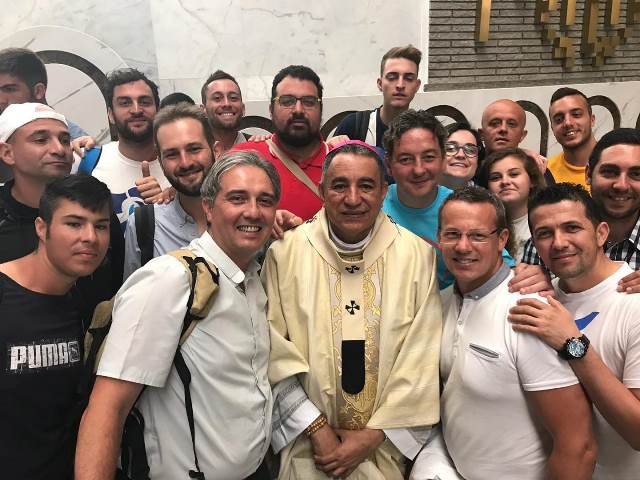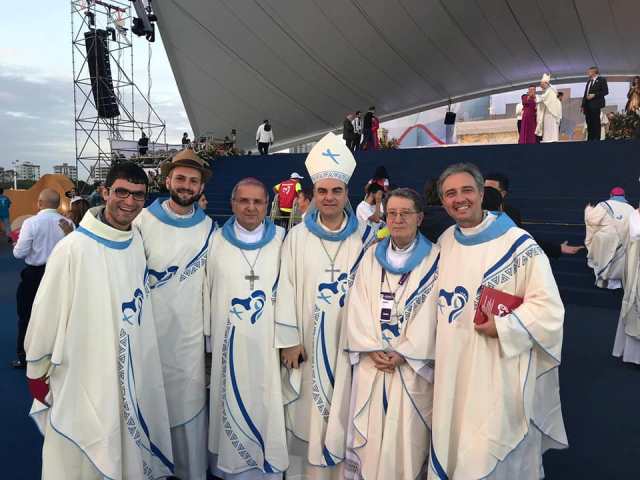 Mio caro fratello Tommaso, vescovo di Pescara, siamo qui godendo del dono della fede, della fraternità, in particolare con i pellegrini arrivati dalla vostra diocesi e oggi, nell’eucaristia, lo abbiamo tenuto molto, ma molto presente. Grazie per questo dono che avete regalato alla Chiesa di Panama voi, pellegrini dall’Italia, questo grande dono della Croce di San Damiano e della Nostra Signora di Loreto. Abbiamo vissuto insieme dei giorni in comunione e fraternità. Lei, come vescovo, si è reso presente attraverso ognuno di questi giovani. Che Dio la benedica