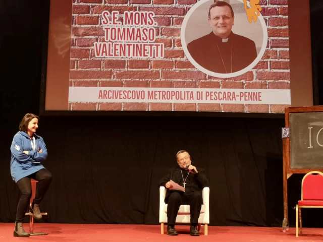 Venerdì sera, in apertura dei lavori, era intervenuto anche l’arcivescovo di Pescara-Penne monsignor Tommaso Valentinetti per salutare i 1.800 partecipanti della Sfs: «Siate creativi, il futuro è vostro – afferma». Agli studenti, monsignor Valentinetti ha raccontato di aver conosciuto un Papa: «San Giovanni Paolo II, ne avrete sentito parlare – racconta rivolgendosi agli studenti – e avrete visto le tantissime immagini delle bellissime Giornate mondiali della gioventù che lui ha voluto. Quando si trattò di varare la Costituzione europea, Giovanni Paolo II disse “Nel preambolo della Costituzione perché non ci mettiamo il riferimento alle radici cristiani ed ebraiche?”. Giovanni Paolo II combattè con tutte le sue forze, ma i grandi politici dissero di no. La conseguenza è che oggi ci troviamo un’Europa nella quale ci siamo dimenticati che chi la voleva desiderava fosse di tanti popoli, che vivevano, cooperavamo, pensavano, giocavano, gioivano insieme e che fosse un grande ponte di collegamento tra nord e sud, tra est e ovest».