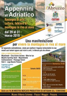 Dal 29 al 31 marzo 2019 al Museo d’arte moderna Vittoria Colonna di Pescara è in programma l’evento «Dagli Appennini all’Adriatico»: rassegna di cultura ed educazione ambientale con particolare attenzione al problema del turismo accessibile per tutti. Il ricco programma sarà condito da musica, rappresentazioni teatrali e folcloristiche, senza dimenticare degustazioni enogastronomiche allestite da produttori del territorio abruzzese.