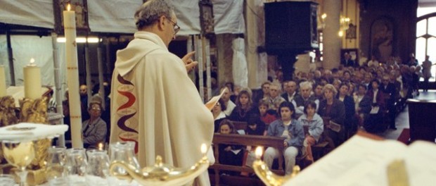 Un parroco pronuncia l'omelia, durante la Santa Messa
