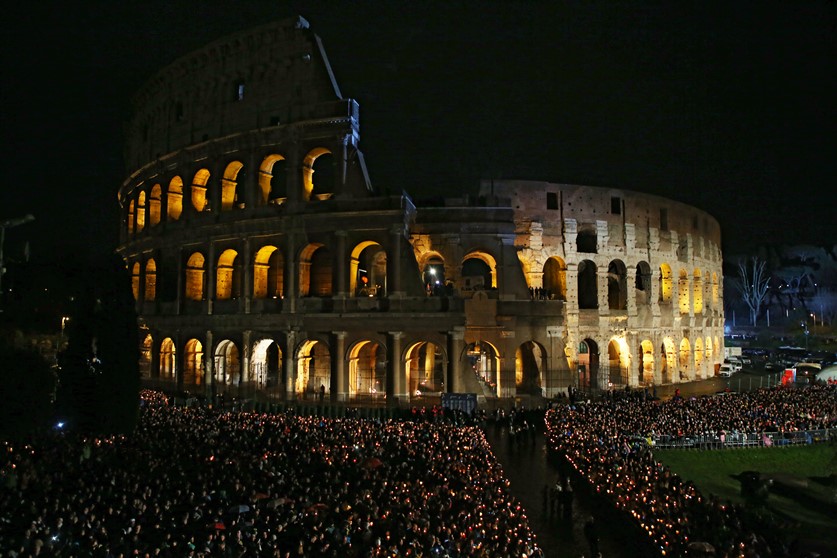 Il Colosseo gremito dai fedeli per la Via Crucis