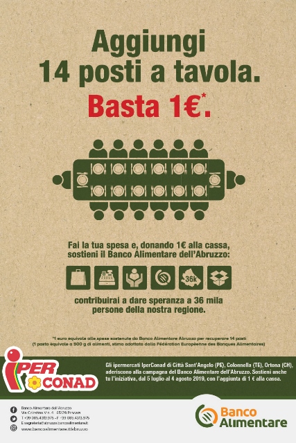 Basta 1 euro per donare 14 pasti a persone bisognose della nostra regione. È il messaggio che fino al 5 agosto verrà lanciato nei punti vendita Iper Conad di Città Sant’Angelo (Pescara), Colonnella (Teramo) e Ortona (Chieti) per richiamare l’attenzione del pubblico su un’emergenza e contribuire a una buona causa. Grazie alla campagna “Aggiunti 14 posti a tavola”, ideata nel 2017 per il ventennale del Banco Alimentare dell’Abruzzo, i clienti Iper Conad potranno scegliere di donare a chi vive nel bisogno 1 euro che verrà aggiunto al conto della spesa.