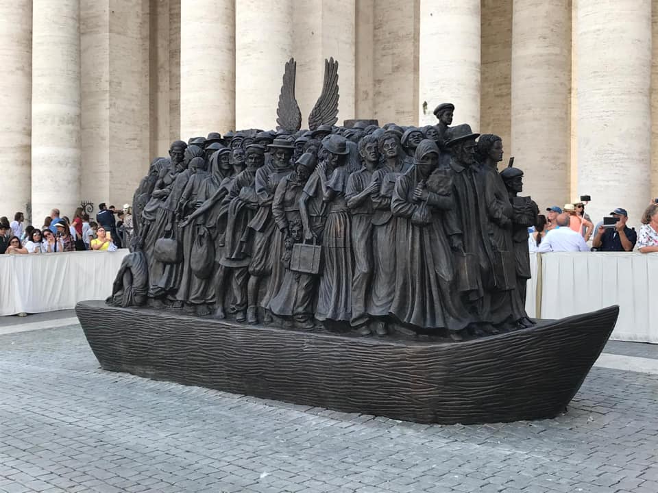 Infine, dopo la recita dell’Angelus e il tradizionale giro in papa mobile, Francesco ha inaugurato, sempre in piazza San Pietro, la scultura dal titolo “Angels Unwares”, Angeli Inconsapevoli, realizzata dall’artista canadese Timothy Schmalz, su suggerimento di padre Michael Czerny, sottosegretario della Sezione Migranti e Rifugiati del Dicastero per il Servizio dello Sviluppo Umano Integrale, che diverrà cardinale nel Concistoro di sabato 5 ottobre. Il tema dell’opera, che raffigura un gruppo di migranti e rifugiati provenienti da diversi contesti culturali e razziali e anche da diversi periodi storici in piedi su di una zattera, rimanda alla Lettera agli Ebrei in cui è scritto “Non dimenticate l’ospitalità; alcuni, praticandola, senza saperlo hanno accolto degli angeli”: «Ho voluto questa opera artistica qui in Piazza San Pietro – puntualizza Papa Francesco -, affinché ricordi a tutti la sfida evangelica dell’accoglienza».