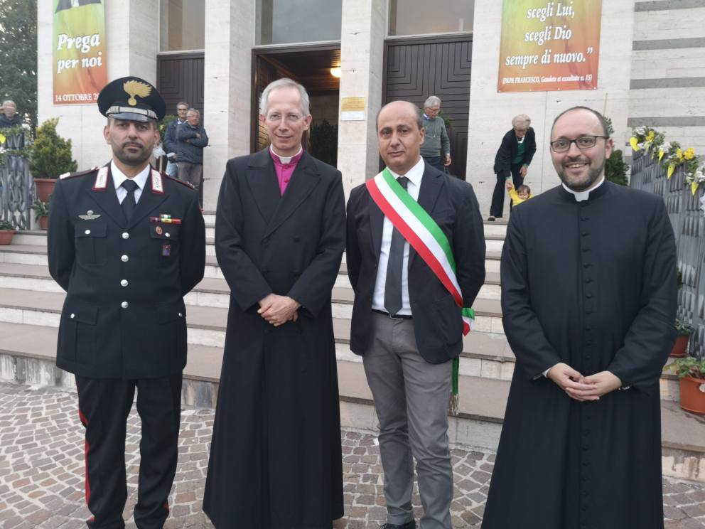 Accolto dal rettore don Mauro Pallini e dal sindaco Nunzio Di Donato, il maestro delle cerimonie liturgiche pontificie ha dapprima visitato il luogo di culto, fermandosi in preghiera davanti al Santissimo sacramento e all’urna di San Nunzio, prima di ricevere il benvenuto dai tanti fedeli che hanno gremito il santuario: «Proprio un anno fa, verso quest’ora – esordisce don Mauro Pallini -, ritornavamo da piazza San Pietro dopo essere partiti al mattino presto con tanti pullman per la canonizzazione di San Nunzio. E quando siamo tornati ricordo la grande gioia. Ci siamo messi davanti all’urna cantando, dando lode per il grande dono della canonizzazione di Nunzio e abbiamo pregato. Quella gioia del 14 ottobre 2018 un po’ si rinnova anche con la sua presenza, visto che quel giorno era in piazza per la canonizzazione di Nunzio. Come vede questo santuario è moderno, nasce ai piedi di questa roccia perché io dico sempre che Pescosansonesco è una piccola Nazareth, un piccolo borgo dov’è vissuto per 15 anni un piccolo ragazzo. Io credo che il mistero della piccolezza avvolga la vita di Nunzio. Lui veniva qui e quando dico ai pellegrini “Guardate che quando camminate qui, le vostre orme saranno combaciate con quelle di Nunzio e quando toccate la roccia molto probabilmente combaceranno anche le vostre mani con quelle di Nunzio”. È una terra benedetta, perché questo ragazzo fondamentalmente penso che ci insegni ad affrontare i dolori affettivi e fisici della vita, come lui li ha avuti in compagnia di Dio. Questo è il grande segreto della felicità è lui in questo è stato un maestro. Durante quest’anno sono venuti in visita 15 mila pellegrini dal Ruanda, dall’Australia, dall’America e da varie parti dell’Europa. Con la canonizzazione si è risvegliata l’attenzione per questo ragazzo. Tanti giovani sono anche venuti qui in pellegrinaggio. È difficile arrivare qui, la strada è tortuosa, come la vita di ogni giorno. Poi arriviamo qui e veniamo ripagati di tutti i sacrifici, che diventano un’oasi di pace. Noi oggi siamo molto contenti che lei oggi è venuto qui a celebrare l’eucaristia. Ieri (domenica scorsa) era impegnato in piazza San Pietro con altri santi. La Chiesa cresce attraverso i testimoni della fede. Ci auguriamo che questo anniversario, per noi, possa essere un rinnovare fortemente la nostra fede, perché Dio ci vuole felici e ci dà la possibilità di esserlo con la sua grazia».
