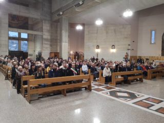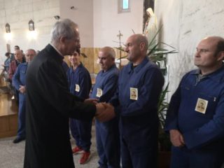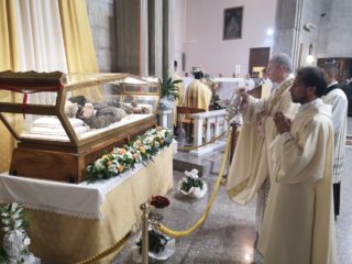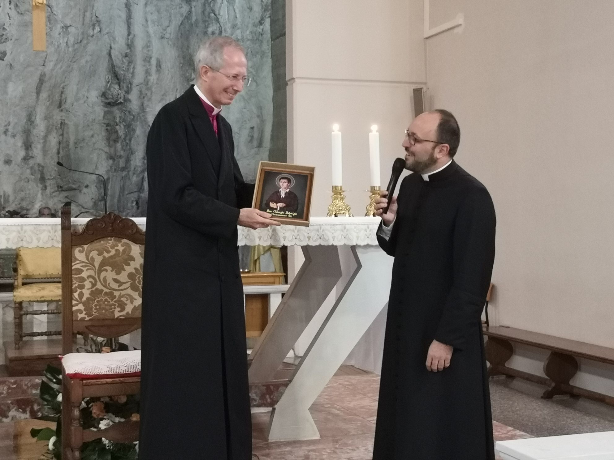 Quindi il rettore del santuario ha omaggiato monsignor Marini, con il dono di un’icona raffigurante il volto di San Nunzio, che ha replicato: «Ringrazio tanto il vostro parroco – afferma il cerimoniere pontificio, originario di Genova -. Sono molto contento di essere qui sia perché la terra abruzzese mi piace molto, quando riesco faccio qualche piccola fuga da Roma e vengo in mezzo a queste montagne che a me piacciono tanto. E poi sono molto contento di essere qui pellegrino tra quei 15 mila pellegrini che, nell’anno, sono venuti per fare questa esperienza di toccare la santità. È sempre molto bello questo, poter andare suoi luoghi dove hanno vissuto i santi, respirare l’aria della santità e, possibilmente, rimanerne anche un po’ impregnati. Voi avete la grazia di poter, abbastanza abitualmente, respirare quest’aria, toccare questi luoghi. Sono tanto contento di avere anch’io, stasera, questa grazia. Non conoscevo Nunzio Sulprizio quando era stata data la notizia che il Papa lo avrebbe canonizzato durante il Sinodo dei giovani. Quella, per me, è stata l’occasione d’incontrare, conoscere questa figura così bella, grande perché piccola come ricordava il vostro parroco. Ho avuto modo di approfondire un po’, di conoscere e in qualche modo questo pellegrinaggio completa questo itinerario di conoscenza e approfondimento della vita di questo santo al quale oggi, insieme a voi, mi affido. La gioia più grande è quella di poter vivere insieme questo momento di preghiera, la celebrazione della messa nella quale ci rivolgiamo al Signore per intercessione di San Nunzio. Ecco, grazie ancora per l’accoglienza così cordiale, così calda, vi sono molto grato e già fin d’ora vi chiedo la carità di ricordarvi di me e io vi assicuro di ricordarmi di voi nella preghiera».