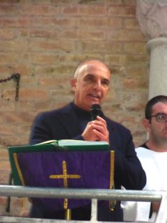 Monsignor Tommaso Valentinetti, arcivescovo di Pescara-Penne, celebra la messa sul sagrato della cappella