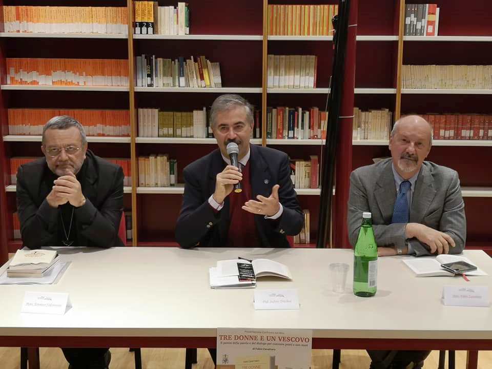 È stato un interessante e stimolante confronto quello avvenuto lunedì, nella Biblioteca diocesana Carlo Maria Martini di Pescara, tra l’arcivescovo di Pescara-Penne monsignor Tommaso Valentinetti ed il giornalista, già vaticanista Rai, Fabio Zavattaro autore del libro “Tre donne e un vescovo. Il potere della parola per costruire ponti e non muri” edito da Dario Flaccovio, all’interno del quale ha raccontato il dialogo dell’arcivescovo con la pastora della Tavola valdese Maria Bonafede, la presidente della Comunità ebraica di Roma Ruth Dureghello e la segretaria della Comunità islamica italiana Ilhamallah Chiara Ferrero.